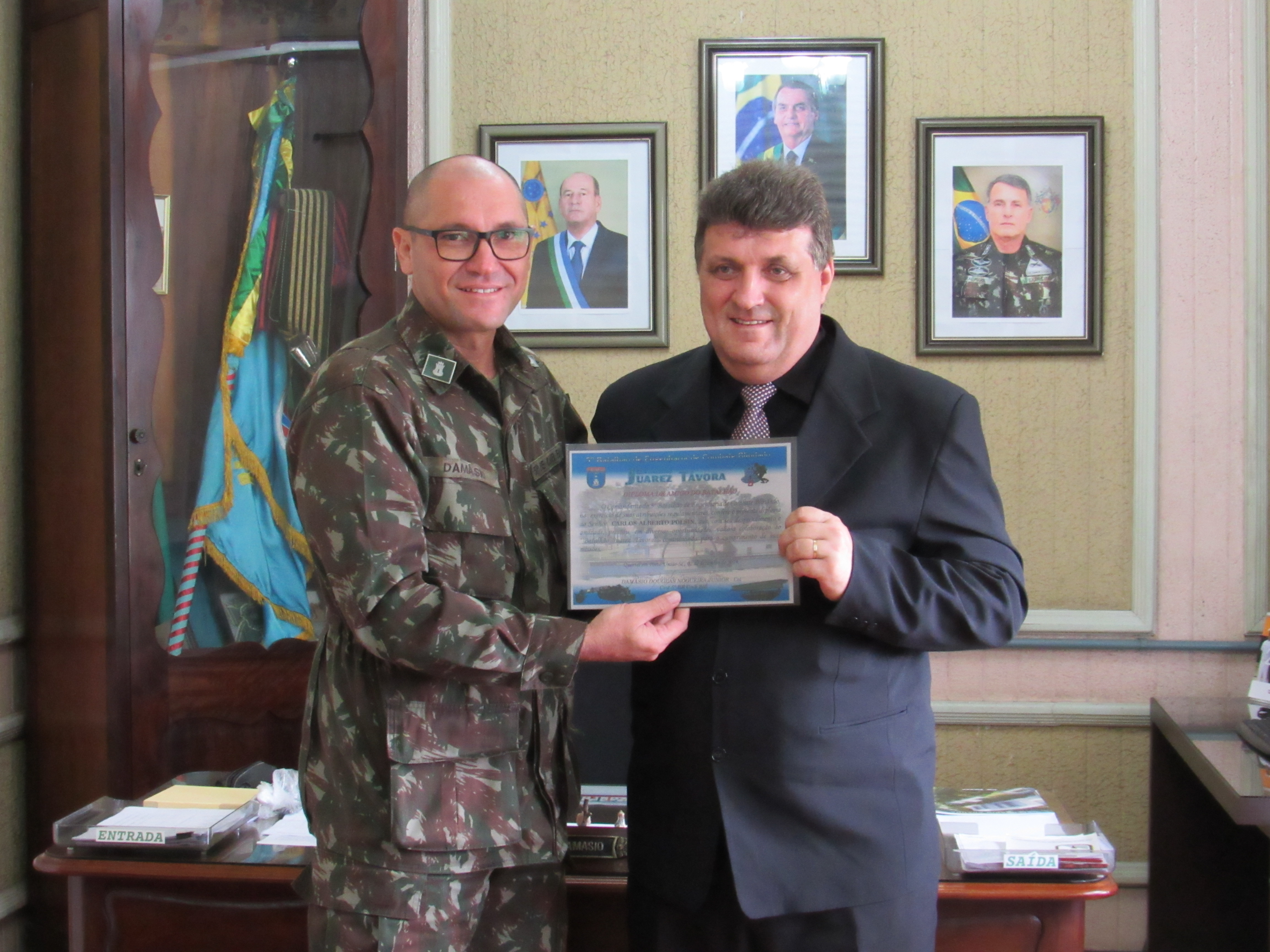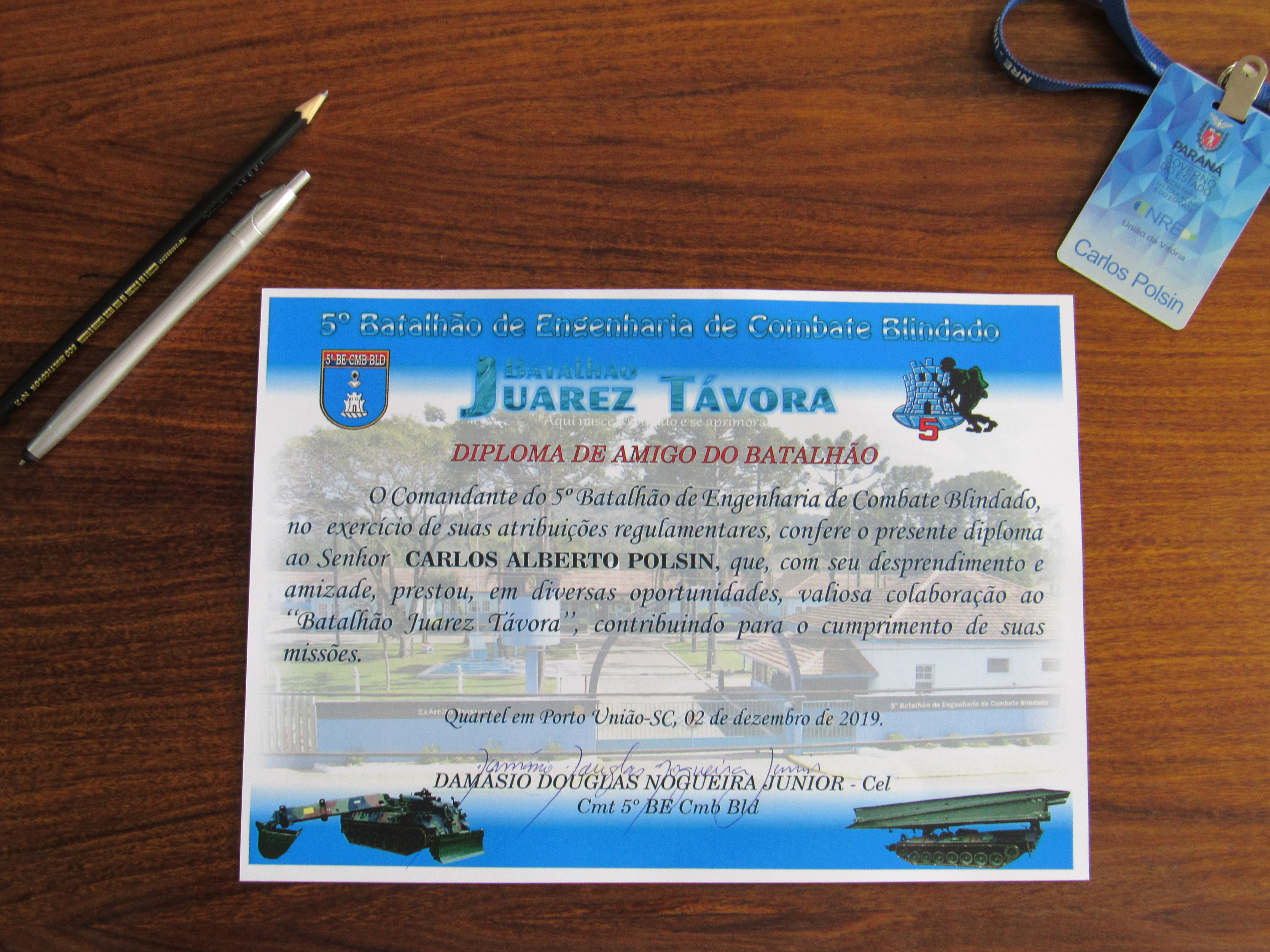 Na manhã do dia 18 de dezembro, o professor Carlos Alberto Polsin, chefe do Núcleo Regional de Educação de União da Vitória recebeu das mãos do Coronel Damásio, Comandante do 5º Batalhão de Engenharia de Combate Blindado - Batalhão Juarez Távora o Diploma de Amigo do Batalhão.